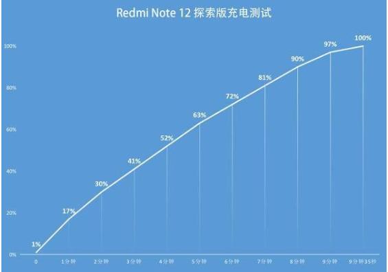 在手机剩余最后 1% 电量,电池预计只剩下 10 分钟使用时长,开始接入 210W 原装充电套装。由于考虑到功率足够大,所以前 90% 采用每一分钟记录一次数据。实测下,Redmi Note 12 探索版这颗 4300 毫安时电池只需要 9 分钟 35 秒就显示充到 100% 电量。1 分钟就已经充入 17%,5 分钟充入 63%,充到 90% 也仅需 8 分钟,充电速度让人非常惊喜。