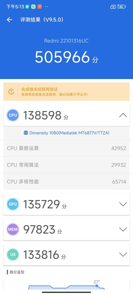 经过实测,在安兔兔平台中Redmi Note 12 探索版跑出了50万分的成绩,而在运行《王者荣耀》时,Note 12探索版同样可以实现相当稳定的帧率表现,最重要的是,得益于天玑1080更良好的能效,以及机身内部强大的散热系统,运行游戏时整机温度控制得相当不错,没有出现发热烫手的现象。