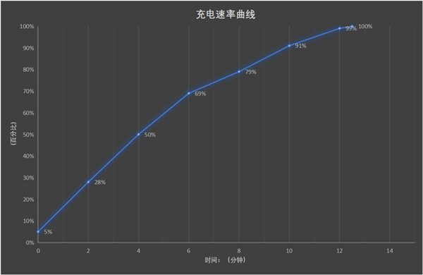 在室温20摄氏度的环境下进行测试,由于充电功率高,速率快,我们每2分钟记录一次电量,从5%开始测试。2分钟充至28%,4分钟充至50%,6分钟充电至69%,8分钟充电至79%。从第10分钟开始,电量达到91%,此时进入涓流充电模式,12分钟充电至99%,完全充满仅需要12分42秒。至于官方宣传的9分钟满电,为实验室数据,与真实数据可能会有细微的差异。