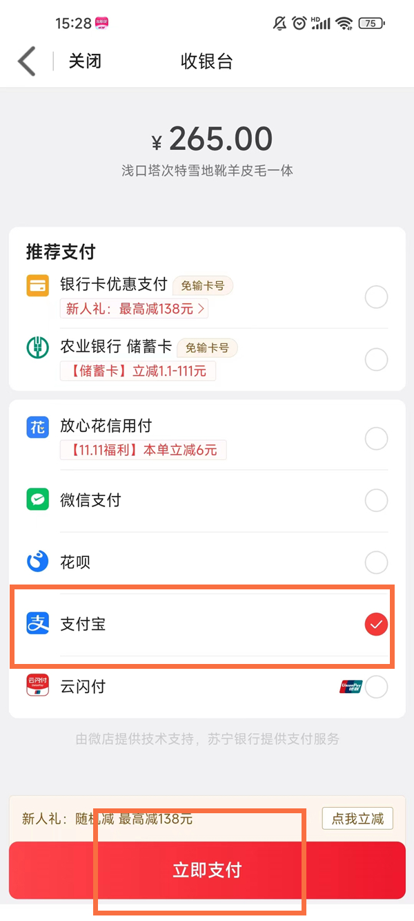 3、选择支付宝,点击立即支付,输入支付密码即可。