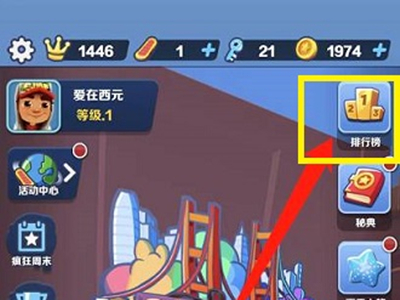 1、进入地铁跑酷首页界面,在首页的界面位置点击右上角的排行榜。