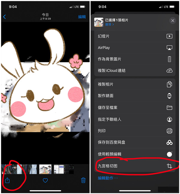 3、添加后,打开某个图片,点击分享图标,选择九宫格切图即可使用。