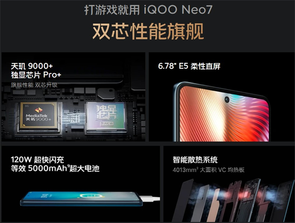 iQOO Neo7依旧是居中挖孔直板造型,屏幕尺寸增加到6.78英寸,材质升级为E5发光材料,120Hz高刷新率1080P分辨率。iQOO Neo7还有封闭式立体双扬以及对称式X轴线性马达,声效表现和手感都更强。追剧的话更畅爽,听歌也有现场感,而玩游戏也同样更有沉浸感。此外,红外遥控、全功能NFC以及更好用的5000万像素OIS三摄。性能部分堪称iQOO Neo7最大亮点,不仅用上了天玑9000+芯片,还辅以LPDDR5、UFS3.1顶级存储,加上4013mm大面积VC均热板,能让天玑9000+性能得到充分释放。
