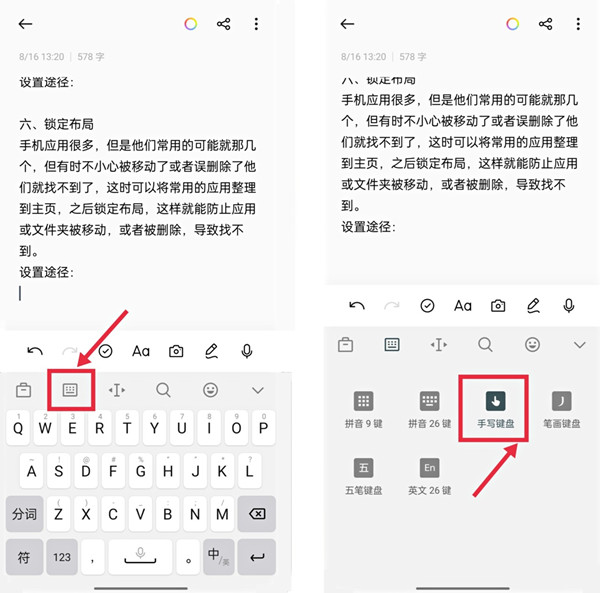 1、在手机上调出键盘,点击键盘选择图标,再点击手写键盘。