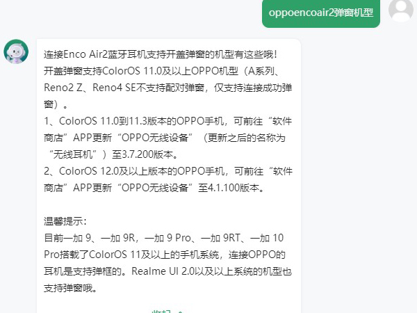 oppo EncoAir2i支持弹窗机型有哪些?oppo EncoAir2i支持弹窗机型有支持ColorOS 11.0及以上OPPO机型(A系列、Reno2 Z、Reno4 SE不支持配对弹窗,仅支持连接成功弹窗)。