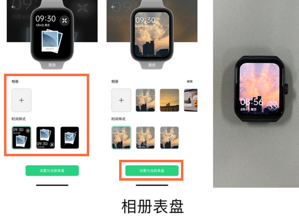 3、点击相册下方的“+”,选择自己需要设置的表盘图案,再选择时间样式,点击设为当前表盘即可。