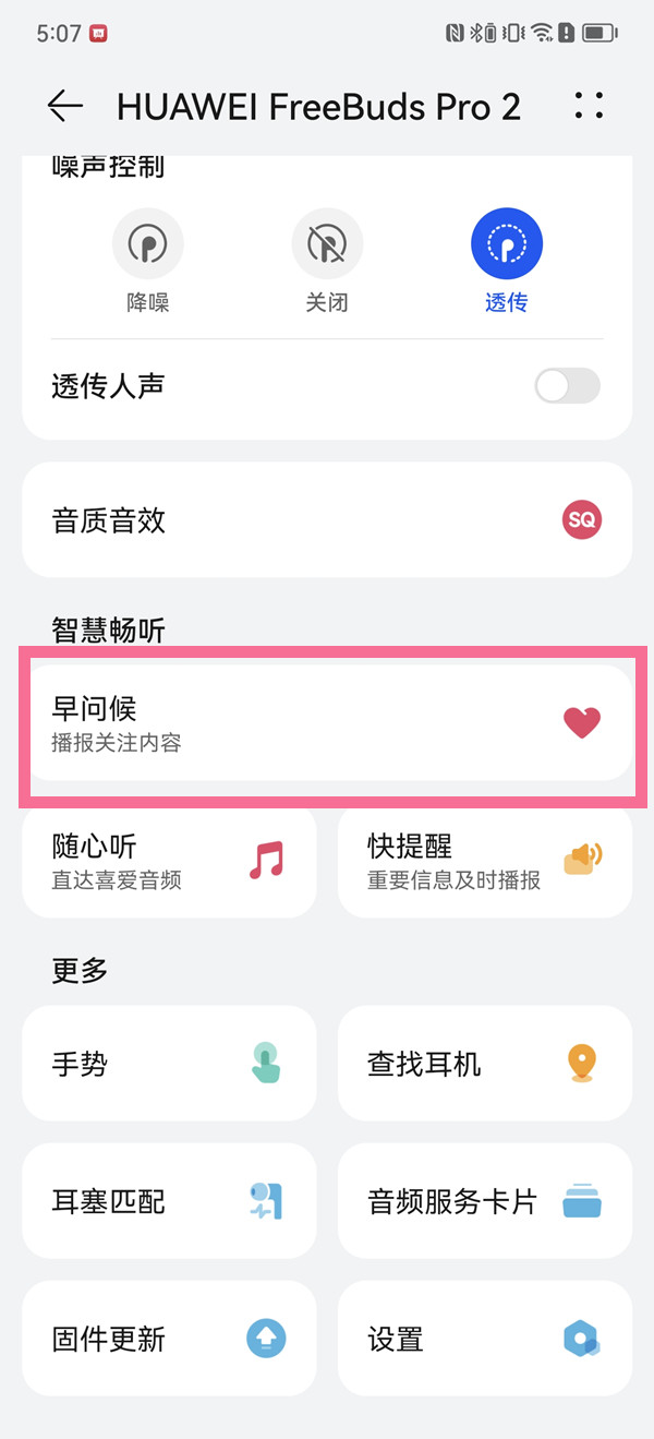 1、连接耳机后,打开智慧生活App,进入耳机详情设置页,点击【早问候】。