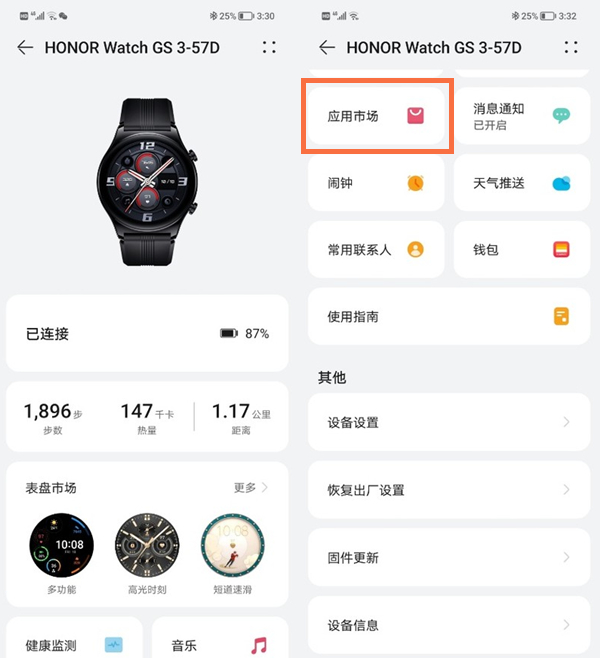 1、打开运动健康APP,进入手表界面,点击应用市场。