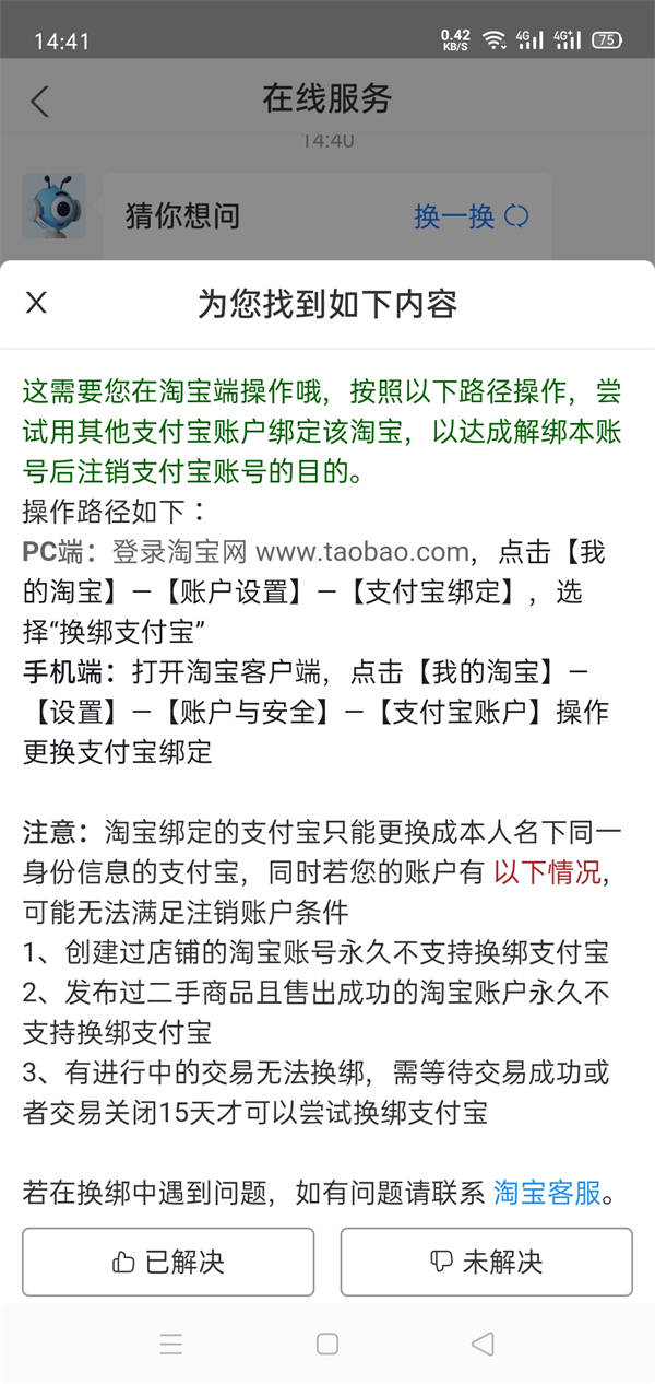 注意:淘宝绑定的支付宝只能更换成本人名下同一身份信息的支付宝,同时若您的账户有 以下情况,可能无法满足注销账户条件。