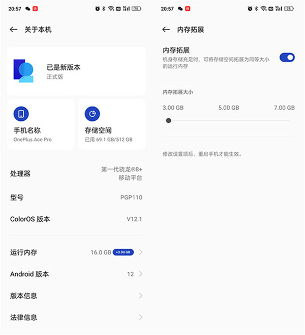 一加Ace Pro配置上非常顶,在RAM方面,虽然各家都有内存融合技术,让ROM的一部分作为RAM使用,而一加Ace Pro直接将12GB RAM当成标准版,16GB RAM大内存的畅快感带给消费者,通过内存融合技术后,可达16GB+7GB的超大运行内存。