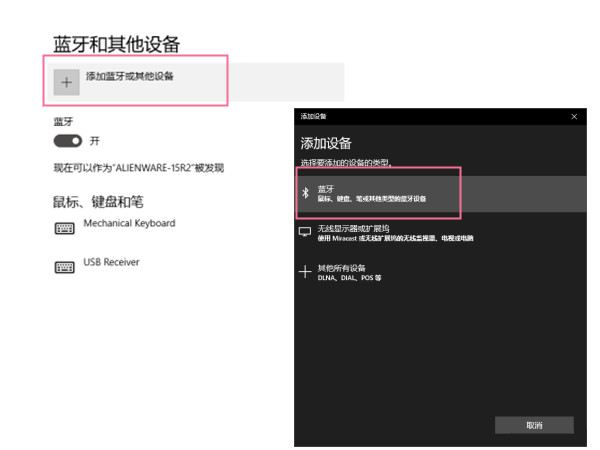 1、进入电脑蓝牙设置,点击添加蓝牙或其他设备,选择蓝牙。