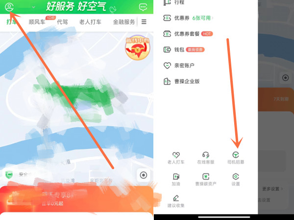 1、打开曹操出行app,点击左上角的头像,再点击司机招募。