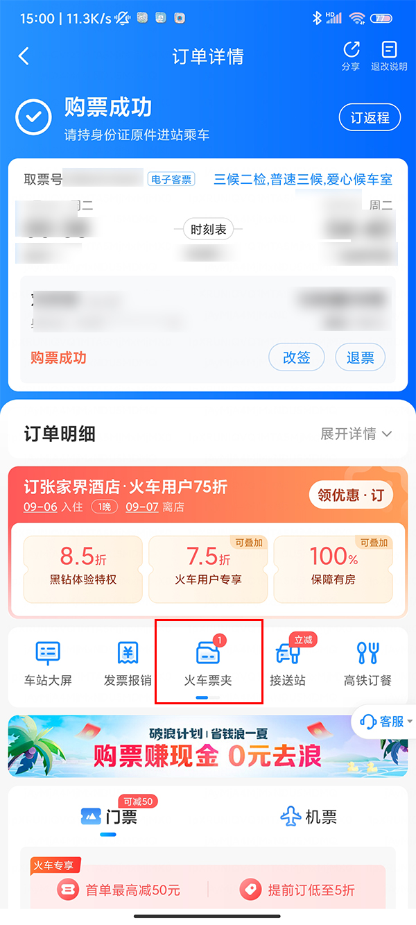 1、找到成功出票的订单,点击进入车票详情。