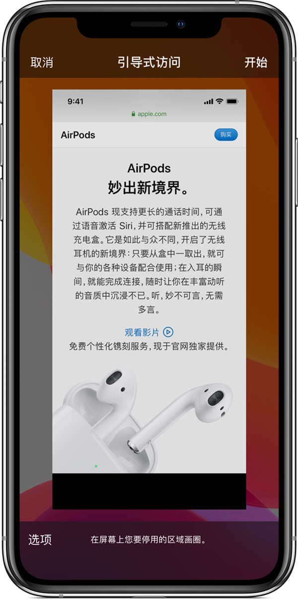 1.要关闭功能或设置时间限制,请连按三次侧边按钮或主屏幕按钮,然后轻点“选项”。如果您没有看到“选项”,请再次连按三次侧边按钮或主屏幕按钮,然后输入您的密码。
