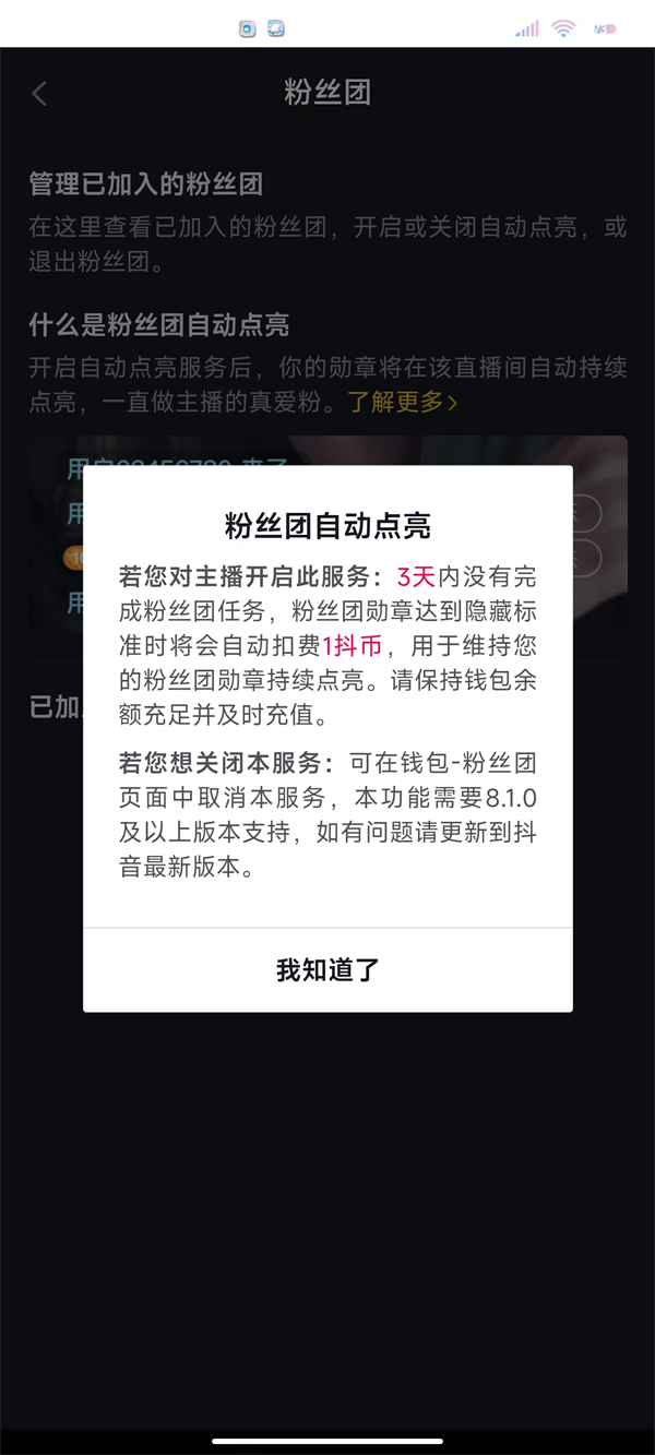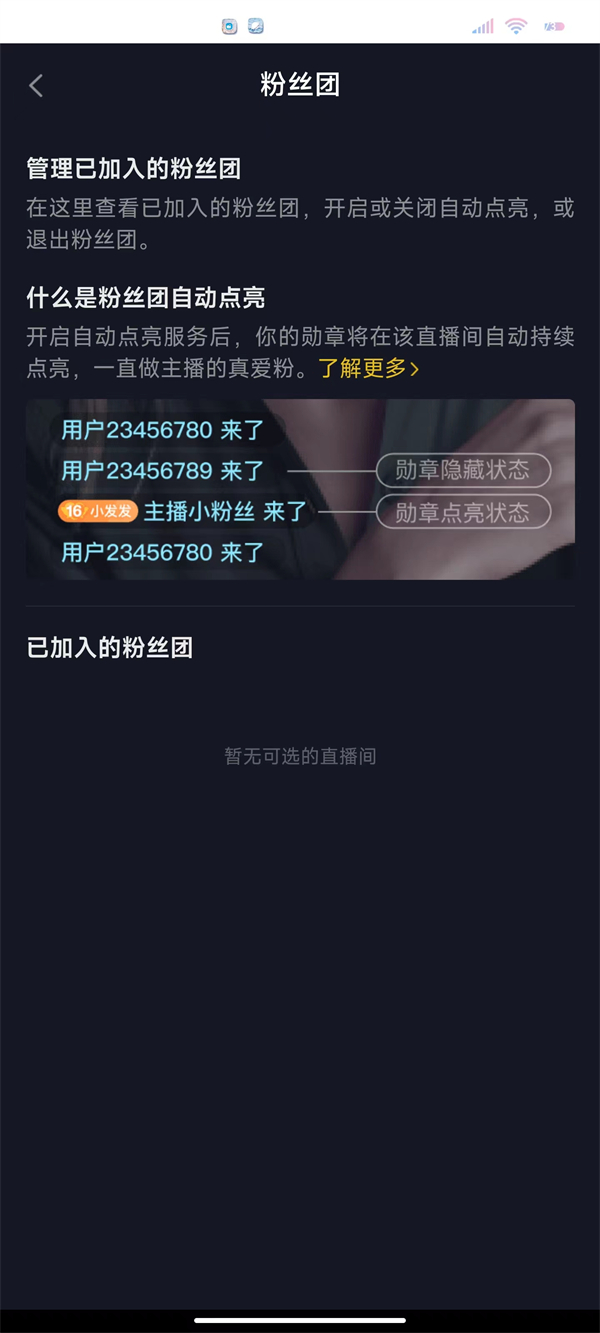 3、点击管理已加入的粉丝团,即可开启/关闭自动点亮粉丝团勋章。