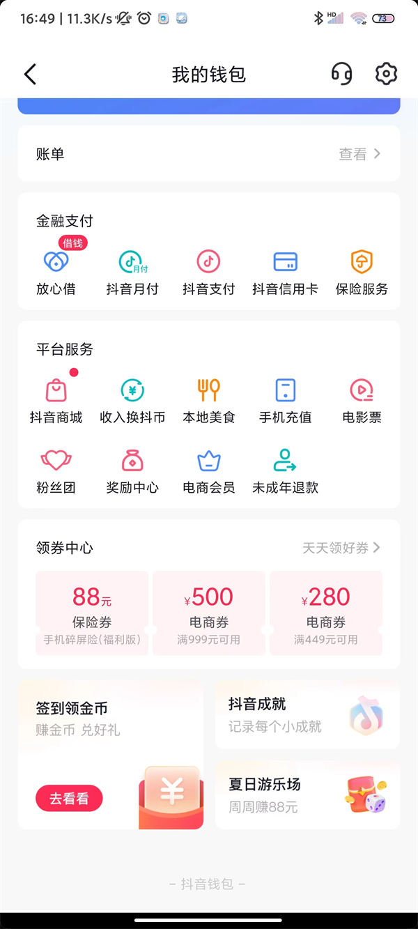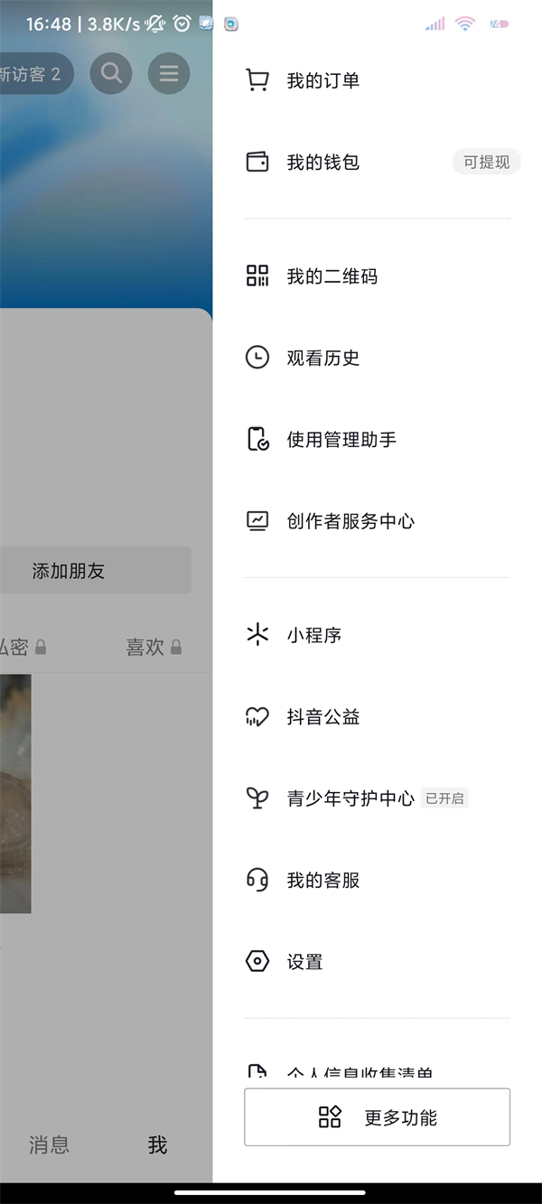 1、打开抖音app,点击我,点击右上角三横图标,点击我的钱包。