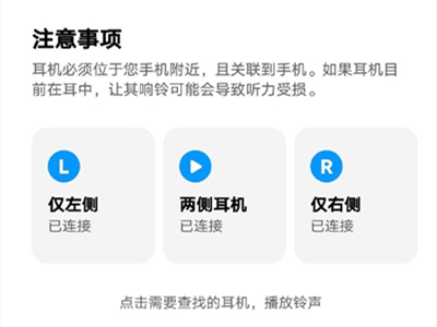注意:耳机必须在手机附近连接手机的状态,如果耳机在佩戴状态,让耳机响铃可能会导致听力受损。