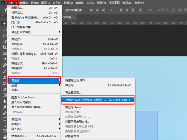 1、在图片编辑界面,点击文件>导出>存储为Web所有格式(或直接按alt+shift+ctrl+s)。