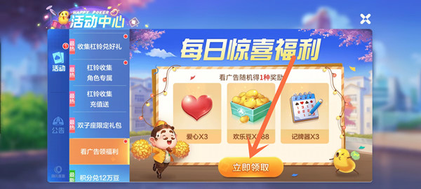 2、在活动选项中点击看广告领福利,再点击立即领取即可。
