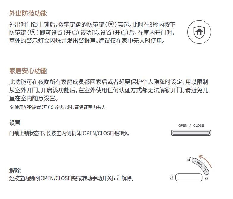 此功能可在夜晚所有家庭成员都回家后或者想要保护个人隐私时设定,用以限制 从室外开门。开启该功能后,在室外使用任何认证方式都无法解锁开门。请避免儿 童在室内随意设置。