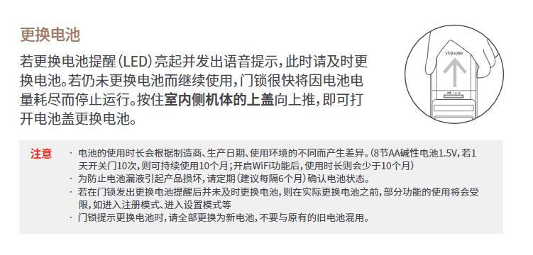 若更换电池提醒(LED)亮起并发出语音提示,此时请及时更 换电池。若仍未更换电池而继续使用,门锁很快将因电池电量耗尽而停止运行。按住室内侧机体的上盖向上推,即可打开电池盖更换电池。