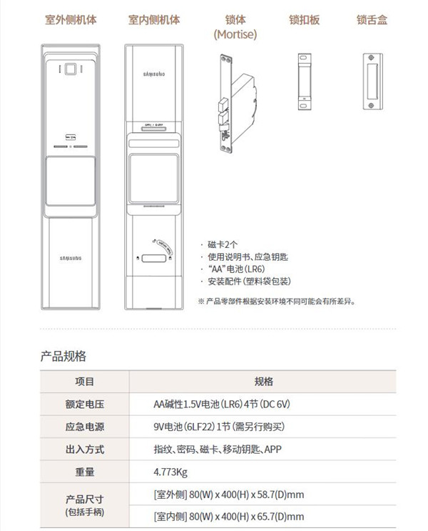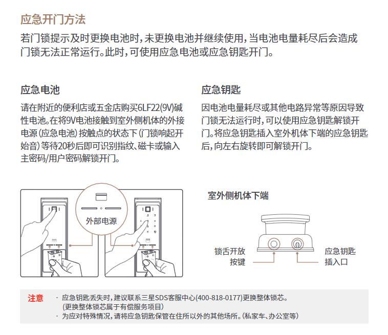 注意 • 应急钥匙丢失时,建议联系三星SDS客服中心(400-818-0177)更换整体锁芯。 (更换整体锁芯属于有偿服务项目)