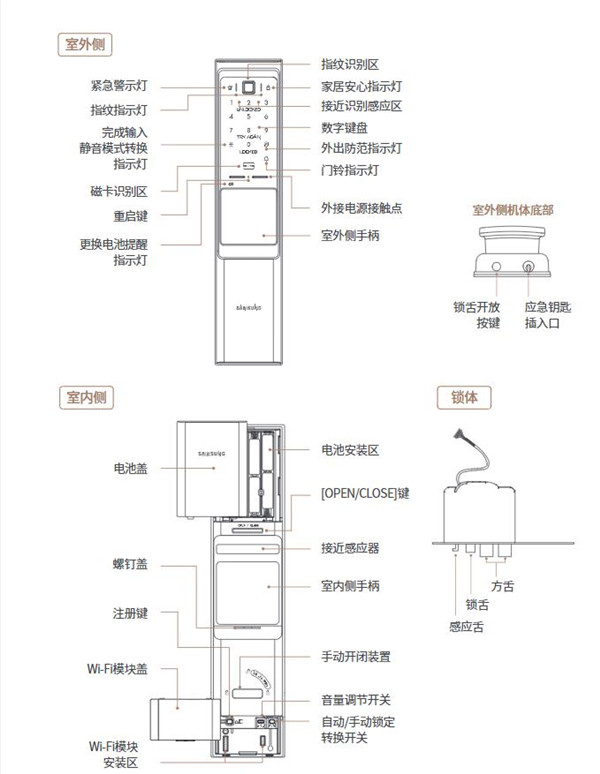 门锁安装有Wi-Fi无线模块,门锁系统初始(默认)设置为开启Wi-Fi使用功能。 若关闭相应功能,则无法使用基于APP的服务。若不使用APP,建议关闭Wi-Fi功 能。(可以减少电池消耗)