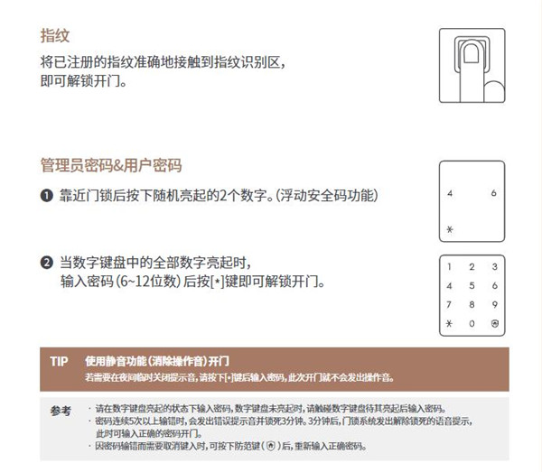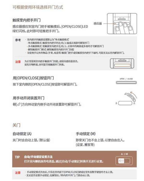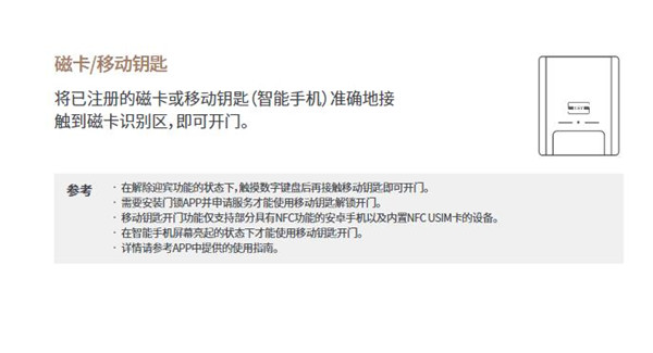 • 若因使用本司规定磁卡之外的其他认证方式解锁导致门锁故障,您的保修将失效。