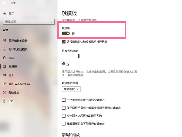 2、点击“触摸板”设置,将触摸板下方的开关关闭或打开即可。