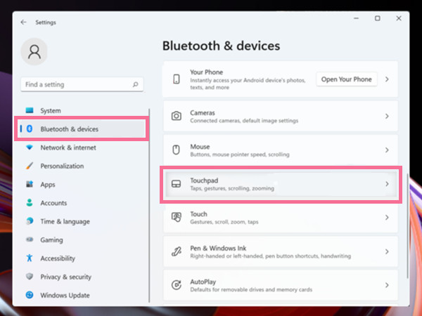 1、进入电脑设置后,在“蓝牙和设备”中点击【触摸板】。