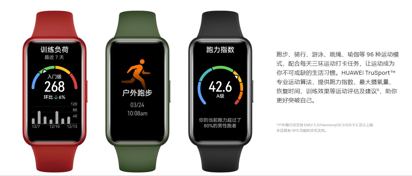 华为手环 7 外观延续了上代的设计,搭载了一块1.47英寸全面屏,配备硅胶表带,但整体机身更加轻薄,机身厚度9.99mm,重量仅为16g,佩戴更加轻盈舒适。还支持5 ATM防水,防水深度可达50米,不惧日常使用的泼溅和下雨天,游泳也能佩戴使用。华为手环 7 配备曜石黑、烈焰红、星云粉和原野绿四款颜色,支持8000+精美表盘,包括了息屏状态也能查看时间的待机表盘,呈现8种月相的月相表盘,以及手机照片自定义表盘等,为消费者提供个性化的选择。