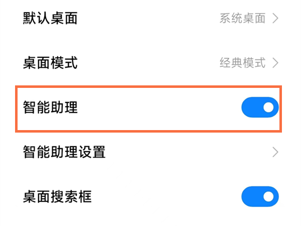 2、进入桌面设置页面后,将智能助理的开关开启即可。