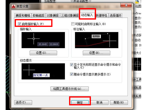 2、点击【动态输入】,勾选【启用指针输入】,点击【确定】即可。