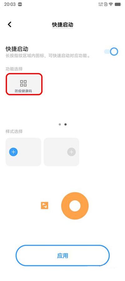 4、开启快捷启动后,在功能中选择【防疫健康码】应用即可。