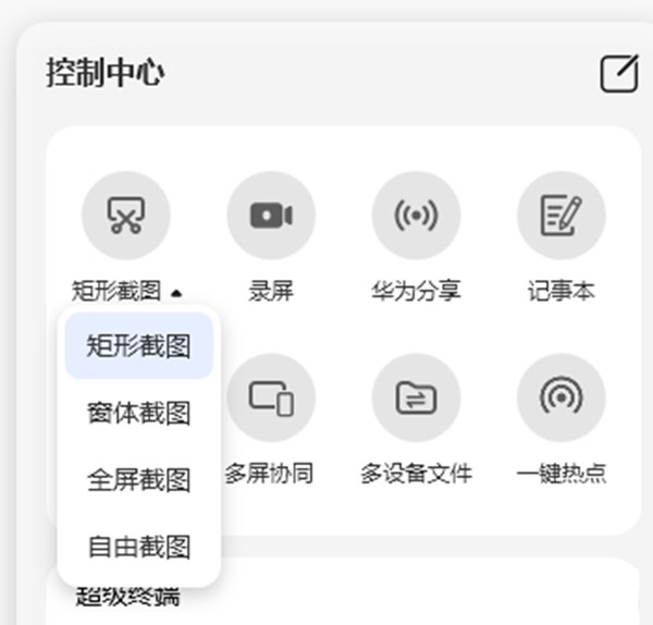 华为笔记本电脑怎么截屏?1、在电脑桌面的右下角点击控制中心图标。