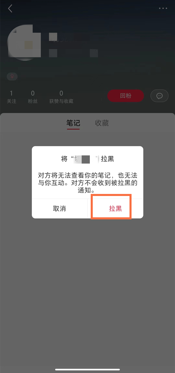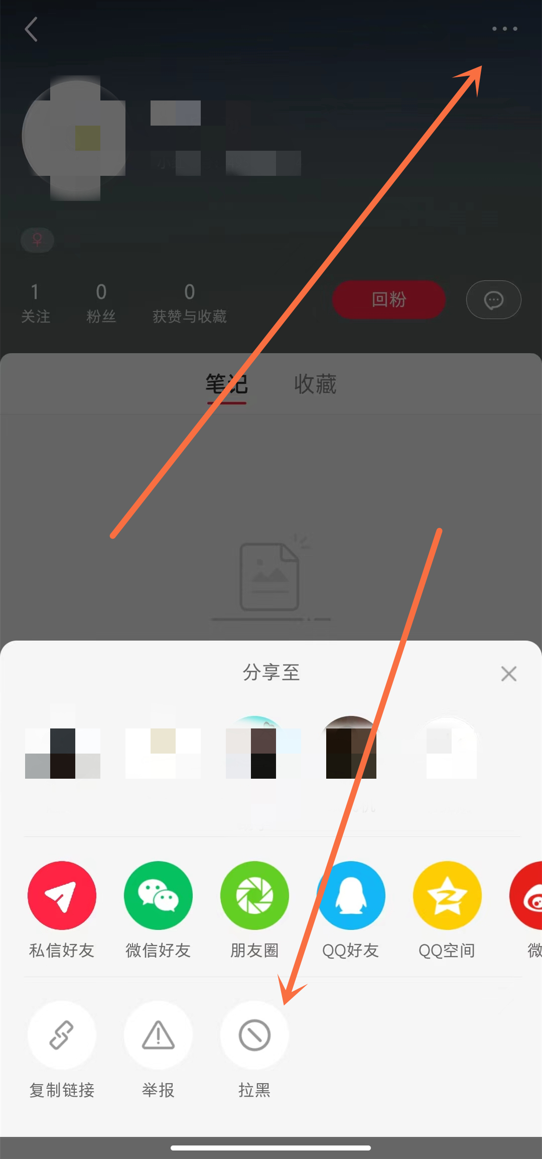 1、打开小红书app,在需要拉黑的用户主页点击三个点,再点击拉黑。