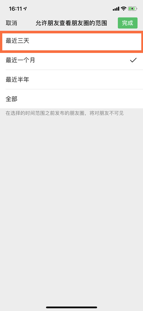 3、在朋友圈权限页面将【允许朋友查看朋友圈的范围】设置为最近三天即可。