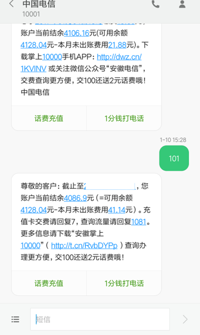 查询中国电信余额直接致电自助客服热线10001,也可以发短信查询,10010是中国联通客户服务号码,发短信查询中国电信余额的具体操作步骤如下: