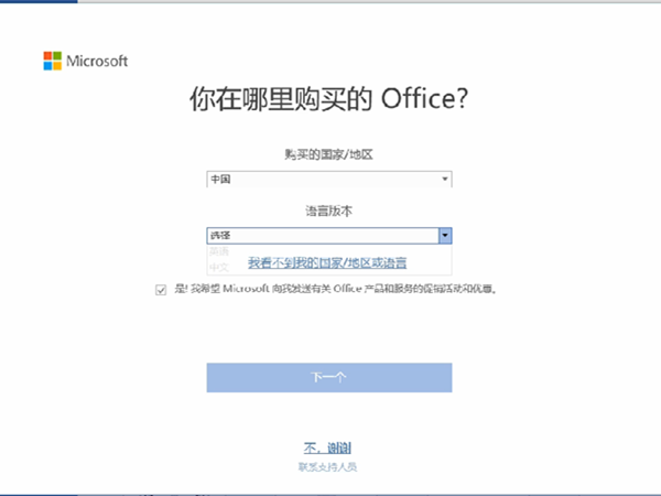 3、根据提示设置地区和语言版本,选择中国和中文,点击下一个。