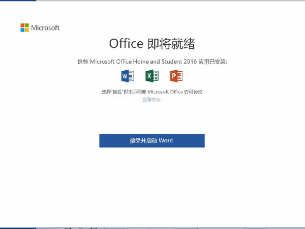 4、稍等一段时间后,收到提示Office即将就绪,点击接受并启动即可激活。