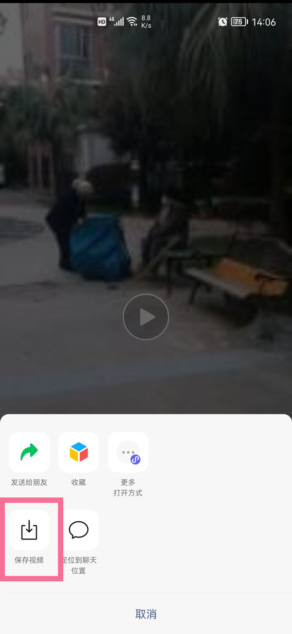 1、在微信聊天对话框打开视频,点击右下角三点,选择【保存视频】。