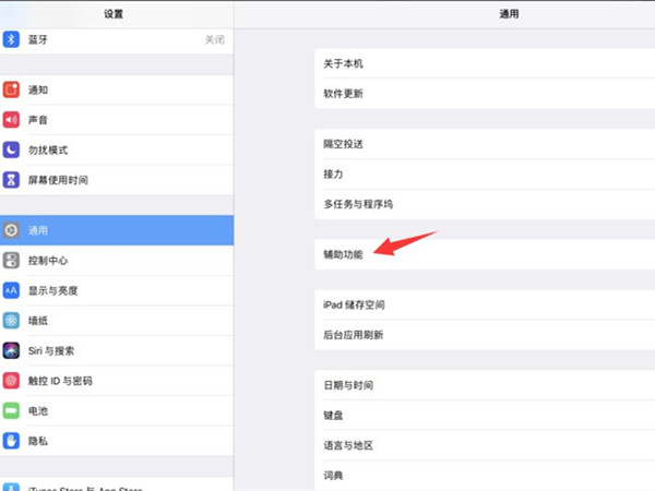 1、打开ipad设置图标,点击通用,点击辅助功能。