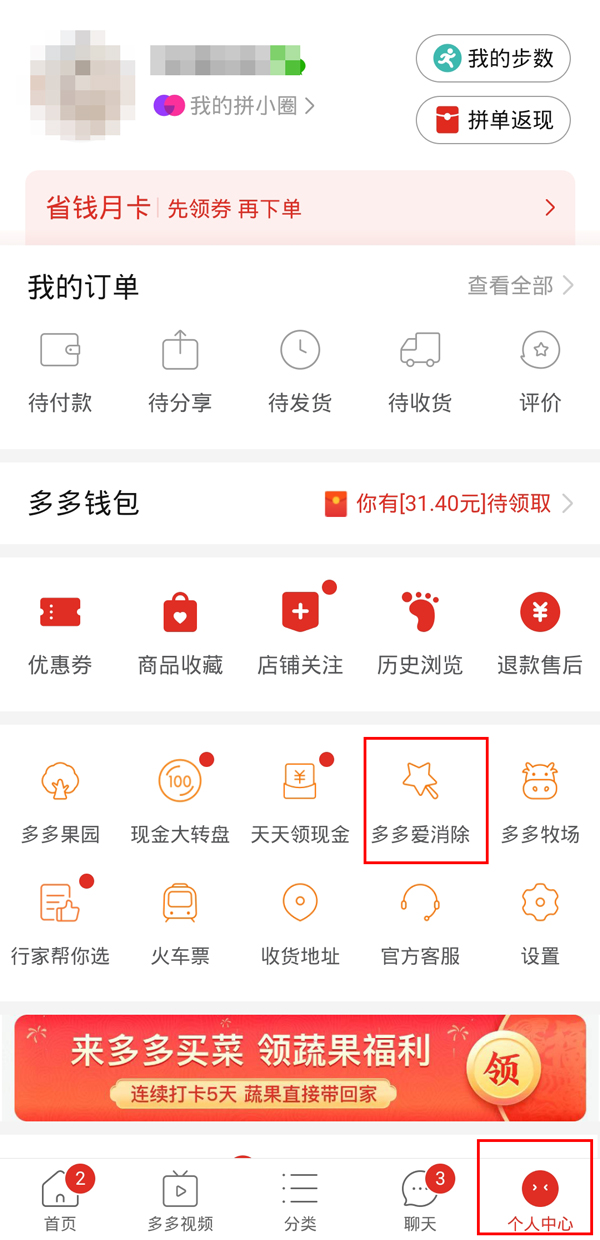1、打开拼多多,点击个人中心,点击【多多爱消除】。