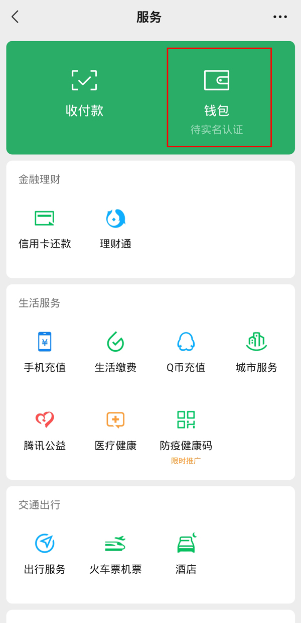 1、打开微信>我>服务,点击【钱包】。