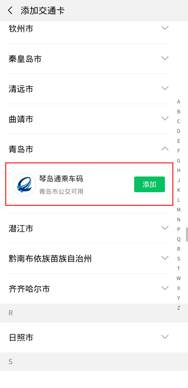 3、找到【琴岛通乘车码】,点击右侧的【添加】即可。