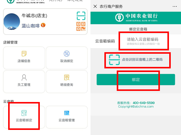 2、登录【农行商户服务】公众号,点击【云音箱绑定】,扫描音箱底部二维码。