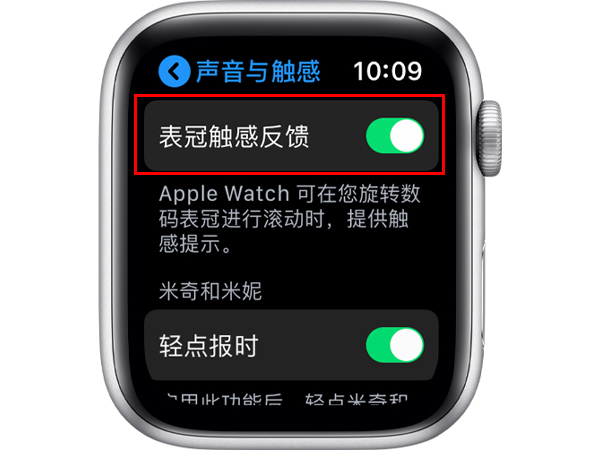 2、找到【触感提醒】,并将【表冠触感反馈】右侧的开关打开即可。