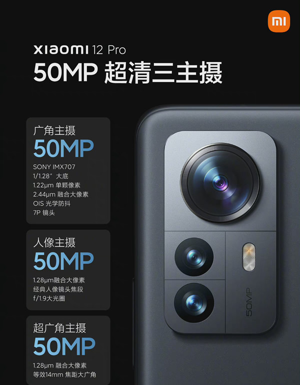 小米12 Pro在行业中率先采用了索尼IMX707传感器作为主摄方案。而这是一款5000万像素、1/1.28英寸的超大底CMOS。其单像素尺寸达到了1.22μm,比大家索尼IMX766(1/1.56英寸)或三星GN1(1/1.31英寸)都要更大一些。因为三摄都是5000万像素,所以打开“5000万模式”时,小米12 Pro是有三档变焦的,同时与这颗超大底主摄搭配的,是一枚5000万像素的等效48mm(也就是2倍焦距)人像主摄,以及一枚5000万像素的115度超广角主摄。不过,除了主摄上支持OIS光学防抖外,另外两颗副摄均不支持OIS。