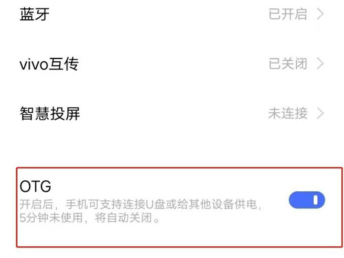 2、点击【OTG】,并打开【OTG】右侧开关。