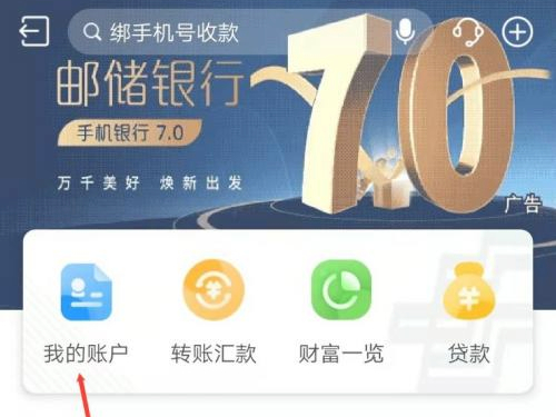 1、登录邮政手机银行,进入主页面,点击我的账户。